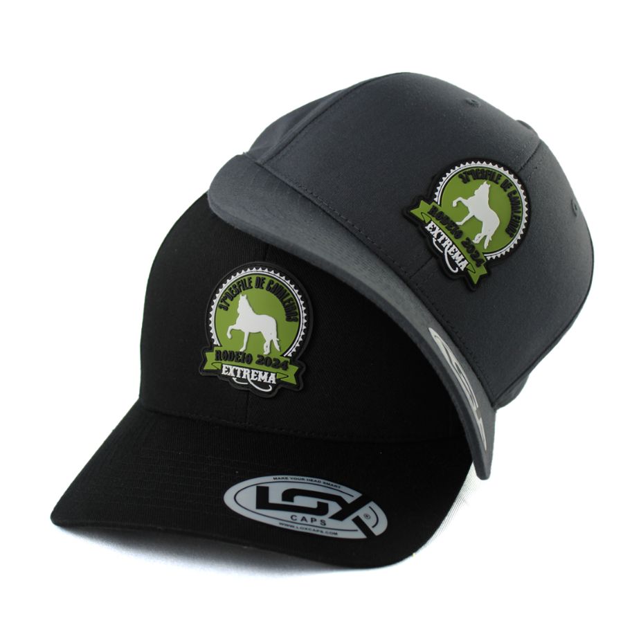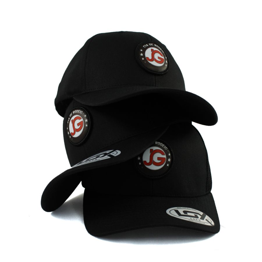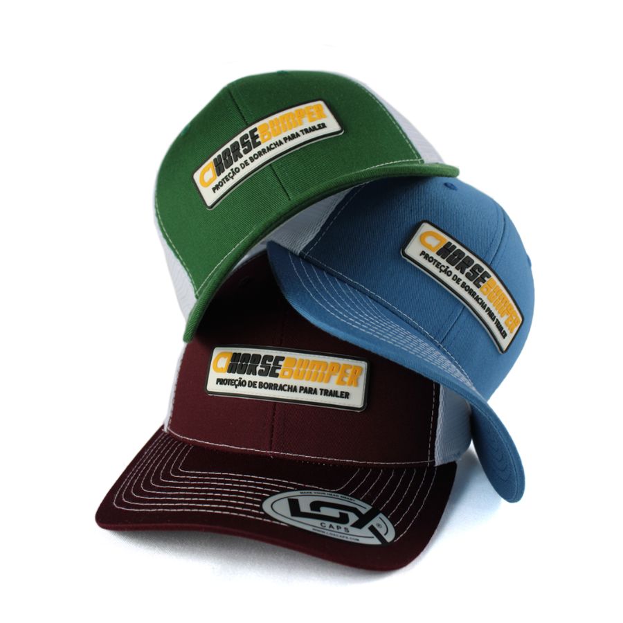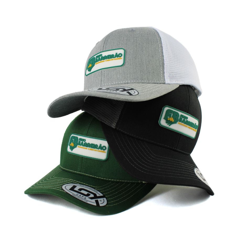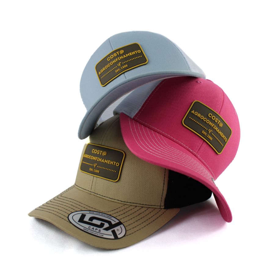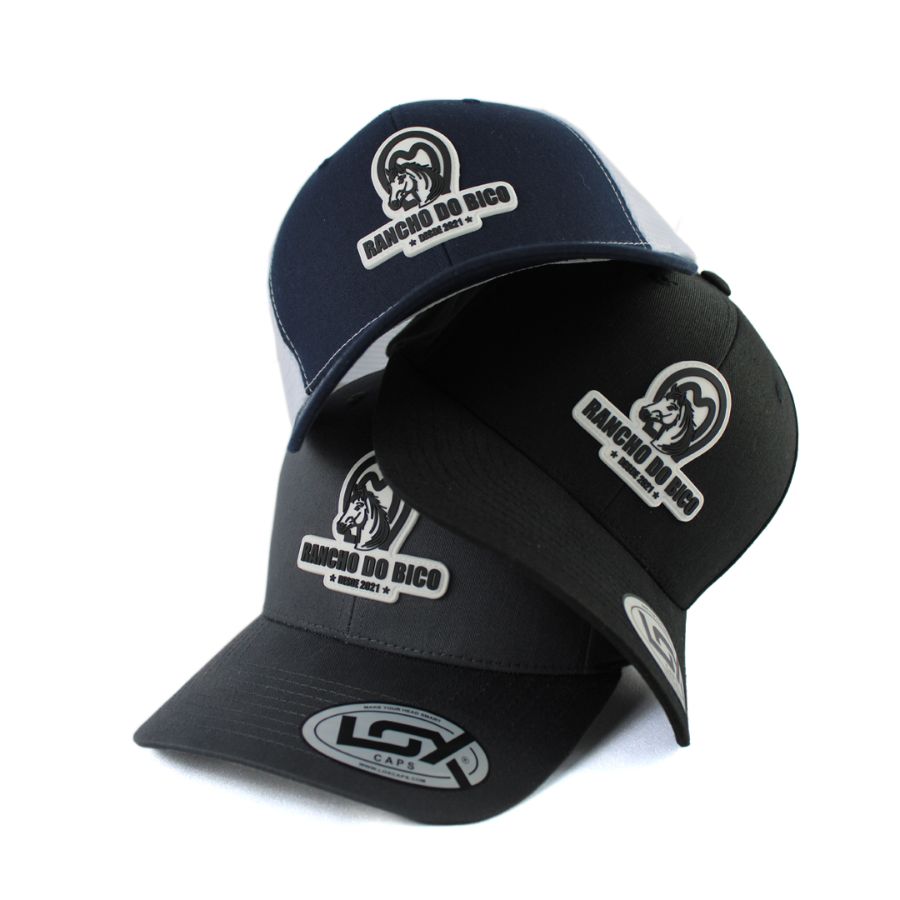 No processo de produção da etiqueta PVC, o molde é criado em alumínio, para ser esculpido na logo do cliente. A borracha líquida é injetada, resultando em uma etiqueta de alta definição, que é costurada manualmente nas extremidades do boné.