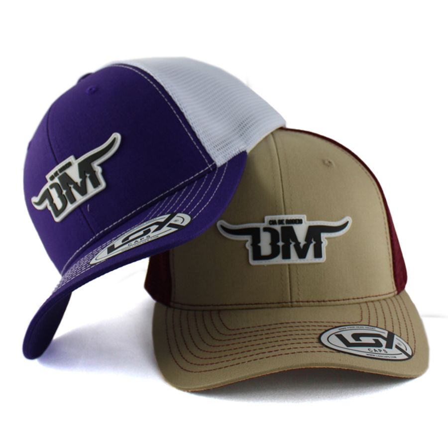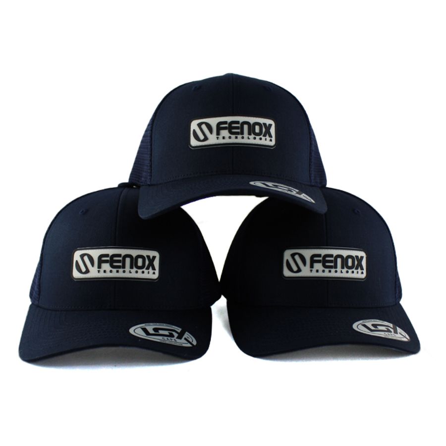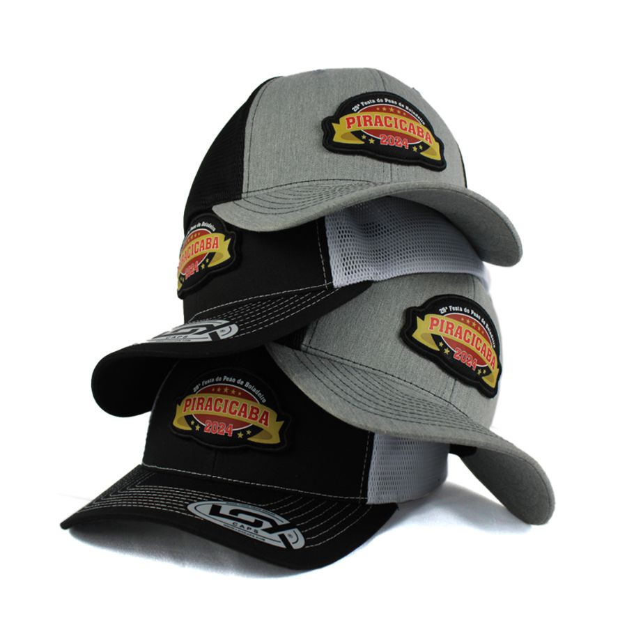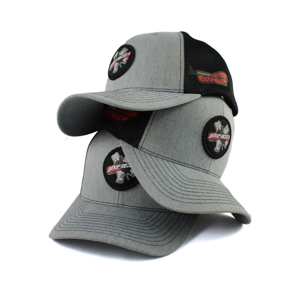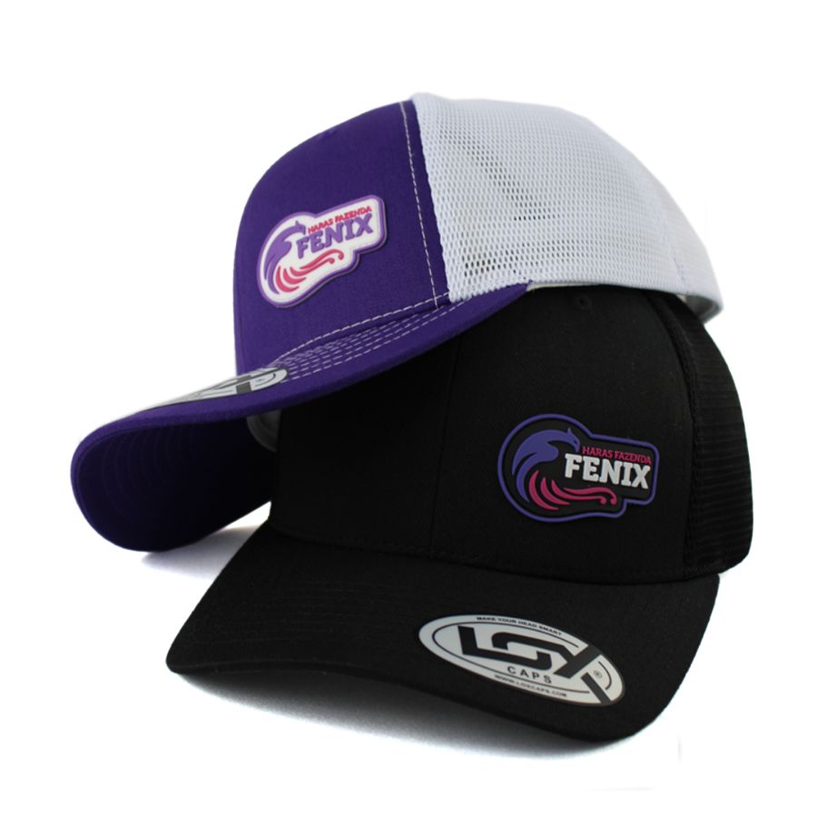 No processo de produção da etiqueta PVC, o molde é criado em alumínio, para ser esculpido na logo do cliente. A borracha líquida é injetada, resultando em uma etiqueta de alta definição, que é costurada manualmente nas extremidades do boné.